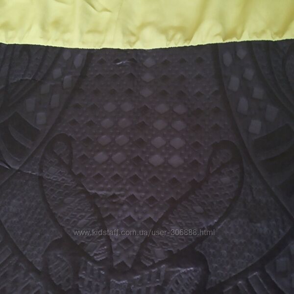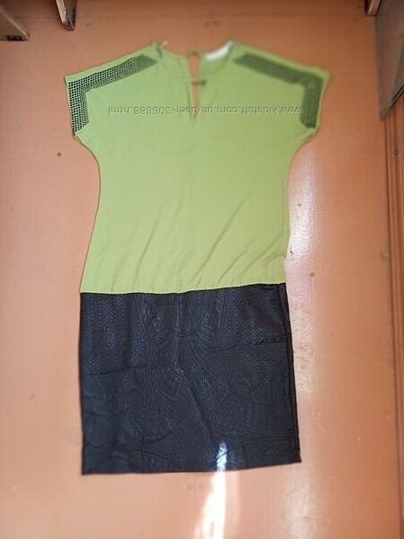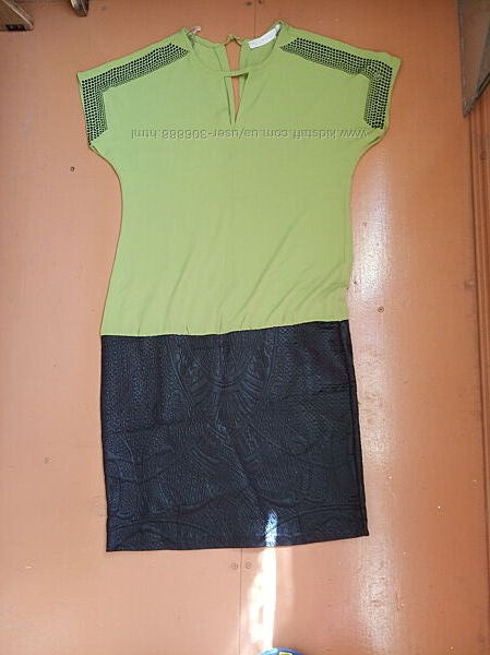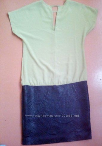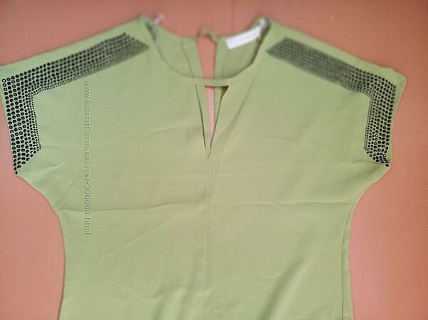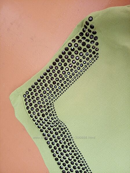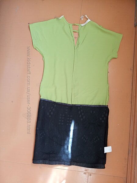 Салатова частина тонка, не просвічується. Чорна частина товста. Плечі викладені чорними стразиками. Кишень немає. На спинці V-подібний виріз можна без проблем зашити по шву або вкоротити.