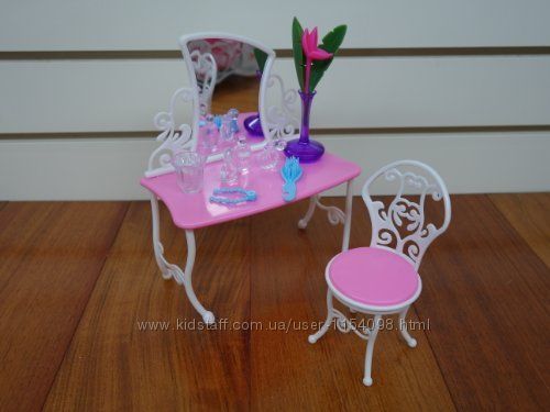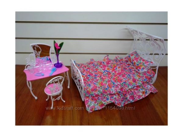 Мебель для кукол Спальная - спальная для кукол Барби, которая состоит из ажурной кровати, трюмо с зеркалом и цветами, а также стульчиком.