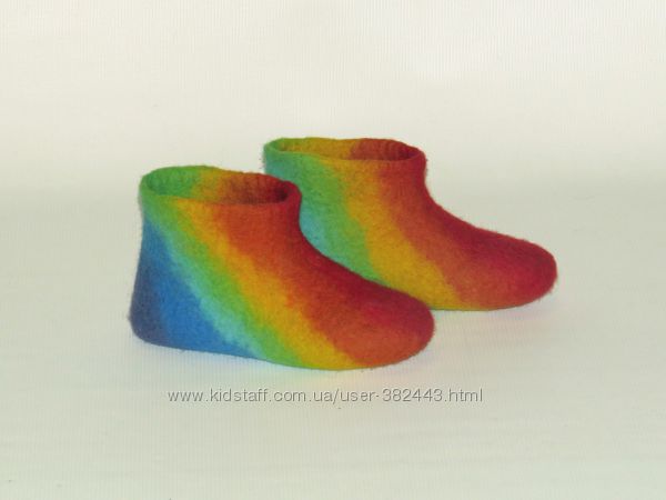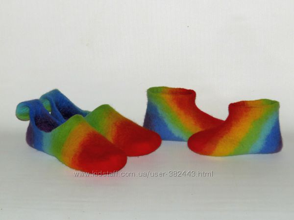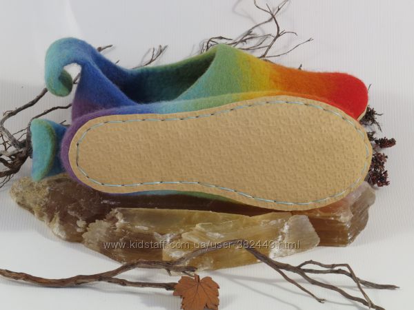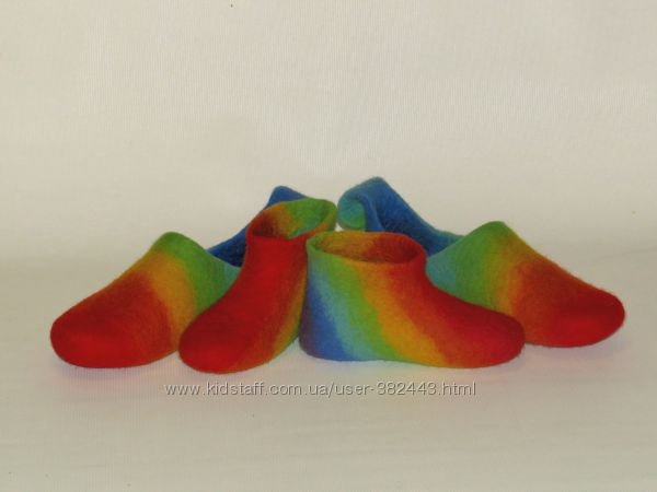 Яркие, теплые и веселые тапочки , от которых становится светлее. Очень мягкие и приятные к телу. Сделаны из натуральной, полезной для ножек 100% шерсти .В валяной обуви ножки всегда теплые и сухие. Подошву можно сделать по вашему желанию:можно подшить натуральной кожей или микропористой резиной 3мм. 100% Ручная работа .Цена указана для взрослых тапочек 37 размера(длина по стельке 24,5 см).