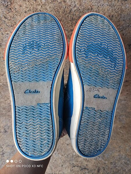 Обалденные, яркие кеды Clarks - оригинал! Сделаны во Вьетнаме из плотнй парусины, носок и пятка - натуральная замша. Внутри подкладка текстильная, х/б. Помимо шнурков по бокам с внутренней стороны есть молнии для удобства. Молнии рабочие.Состояние превосходное, никаких дефектов. Подошва Non-marking - не оставляет следов на поверхности (например, на полу спортзала).