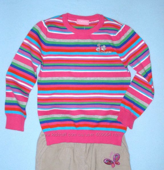 ФОТО 8- Хлопковый Джемпер-Яркие разноцветные полоски, серебряная вышивка Бабочка слева на груди