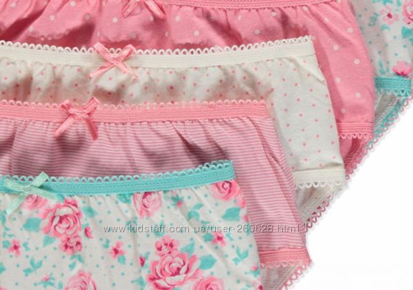 5 трусиков в разнообразных розовых оттенках и полосках. Каждая пара выполнена из дышащей чистой хлопчатобумажной ткани и украшена блестящим бантиком.