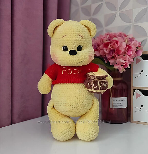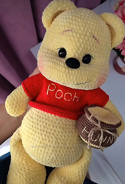 Особливості: дитяча м’яка іграшка ручної роботи Вінні Пух – сувенірна іграшка своїми руками. Зустрічайте улюбленого ведмедика Вінні-Пуха, який ожив з мультфільму і тепер готовий стати частиною вашого дому! Ця велика м’яка іграшка ручної роботи виконана з любов’ю і увагою до деталей. Висота іграшки – до 35 см, і вона може самостійно стояти, що робить її чудовим доповненням до будь-якої колекції. Іграшка в’язаний Вінні-Пух має рухомі ручки та ніжки, що додає йому особливого шарму. Він одягнений у червоний светрик з милесеньким написом на англійській мові «POOH», що додає ще більше чарівності та стилю. У його руках – маленька баночка меду, на якій написано «Hunny», що робить іграшку ще більш схожою на героя, якого ми всі любимоДругие объявления продавца