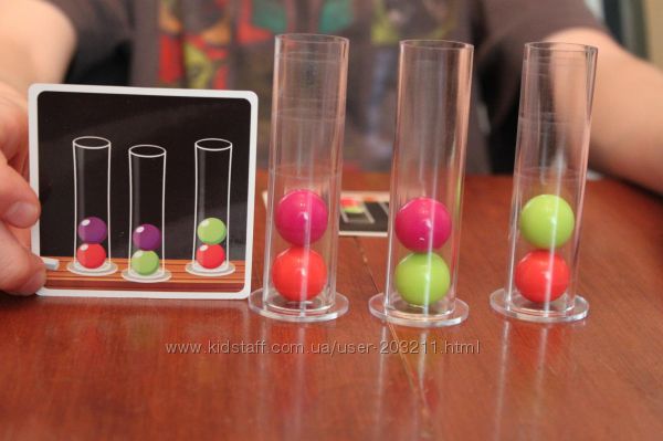 Один из игроков открывает верхнюю карту задания, в котором указано какие шарики, какого цвета, и в каком порядке должны быть расположены в пробирках участников. Не спите, уже можно начинать играть!