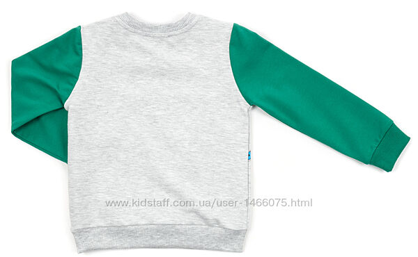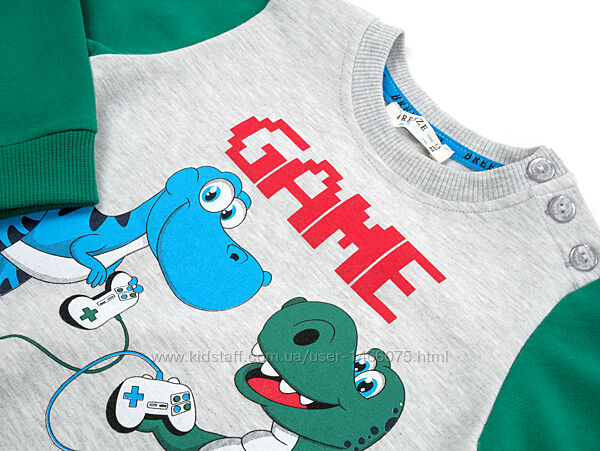 Затишний світшот прямого силуету, прикрашений яскравими фігурками динозаврів. Кругла горловина, манжети довгих рукавів, низ світшота оброблені подвійною якісною трикотажною резинкою. У розмірах 86 см і 92 см в плечовому шві є застібка на три перламутрові ґудзики.