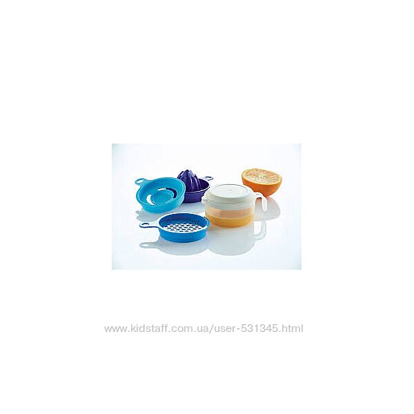Набор состоит: ― из полупрозрачного кувшинчика с удобной ручкой и носиком, ― круглой крышки, ― соковыжималки для цитрусовых, ― сепаратора для яиц и терки. В крышке кувшинчика предусмотрены два выреза, один ― для разливания, а второй – для «отсеивания», чтобы, например, во время разливания напитков зернышки и фруктовая мякоть оставались внутри кувшинчика. В поварёнке можно хранить приготовленные продукты, достаточно только крышку повернуть так, что она закрыла разливное отверстие. Каждая из насадок снабжена удобной ручкой. Специальный выступ с нижней стороны насадок позволяет устойчиво разместить их на любой емкости Tupperware нужного диаметра. Каждая из насадок поистине уникальна.