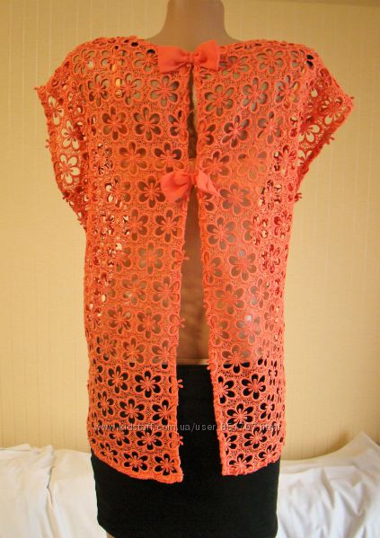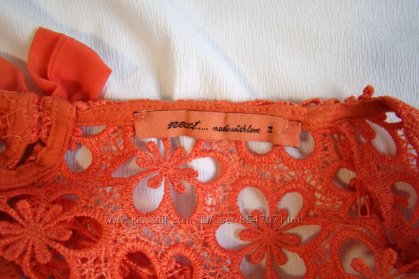 Блузка женская кружевная гипюровая нарядная Next (размер 48 (M, UK14, EU42)Цвет терракотовый. Изготовлена из плотного кружевного материала, 100% полиэстер, бейка 100% вискоза. Размер 48 (M, UK14, EU42). Ширина по пройме 52 см, по плечу 18 см. Длина от плеча до низа 66 см.