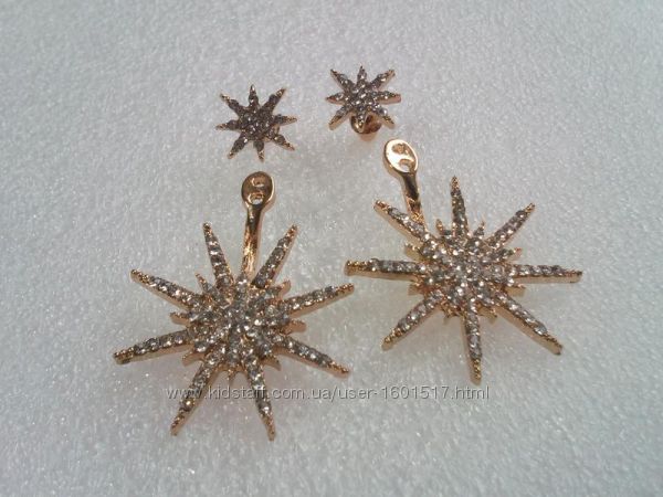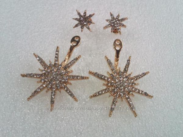 Очень,очень красивые каффы в виде звезды,состоящие из двух частей. Каффы все усыпаны камнями,под золото. Смотрятся на ушках обалденно и дорого.Указана цена за 1 пару.