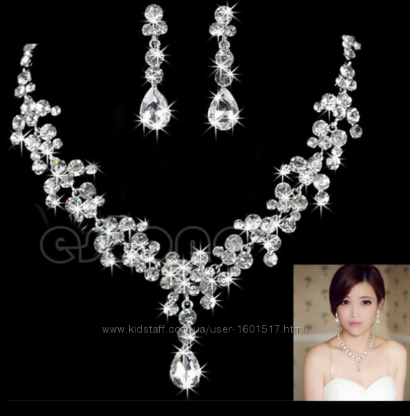 Под золото,с австрийскими кристаллами нежно-голубого цвета. В наличии два цвета:голубой и красный.Смотрится очень красиво.В наличии много разных наборов.Есть наборы с тиарами,тиары отдельно.