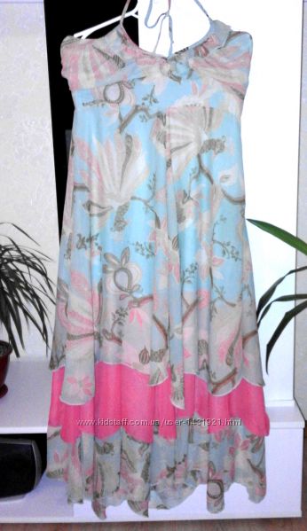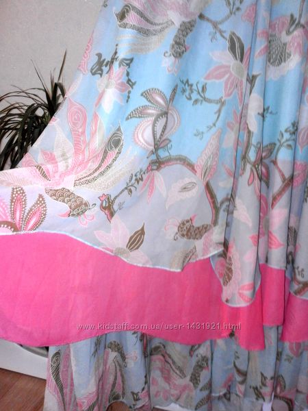 Продам очень красивое шифоновое платье сарафан с экзотическим рисунком. Выглядит утонченно, нарядно и очень красиво. Сочетание нежно голубого и розового цвета шифона придают ему свежести и легкости. А необычайный и красивый рисунок с экзотическими птицами создают неповторимый вид. Размер 50-54.Состояние новой вещи