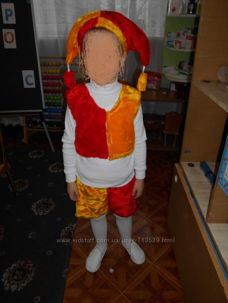 Продам костюмчик Скомороха в идеальном состоянии. Одет 1 раз аккуратно. В комплекте: шапка, бриджи и жилеточка. На жилеточку с внутренней стороны пришила крючки, чтоб можно было ее скрепить (по желанию можно их и убрать). На фото рост 117 см.