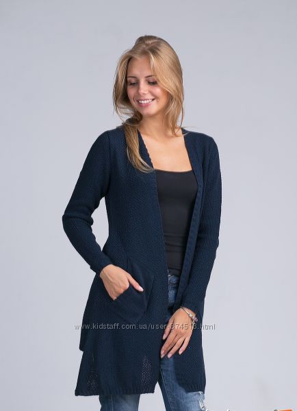 Асимметричный крой, тонкая структурная вязка, полы спереди длиннее спинки, накладные карманы