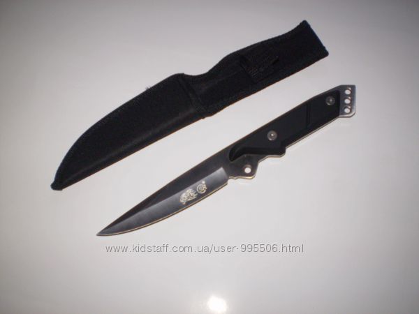 Нескладной нож выполненный в "тактическом" стиле. ХАРАКТЕРИСТИКИ: - длина ножа, мм: 238 - длина клинка, мм:116 - длина рукояти, мм: 122 - ширина клинка, мм: до 25 - толщина клинка, мм: 2.8 - твёрдость стали: 55,6 HRC +/- 1 единица - материал рукояти: металл, пластик - материал ножен: ткань Вес г: 111,5