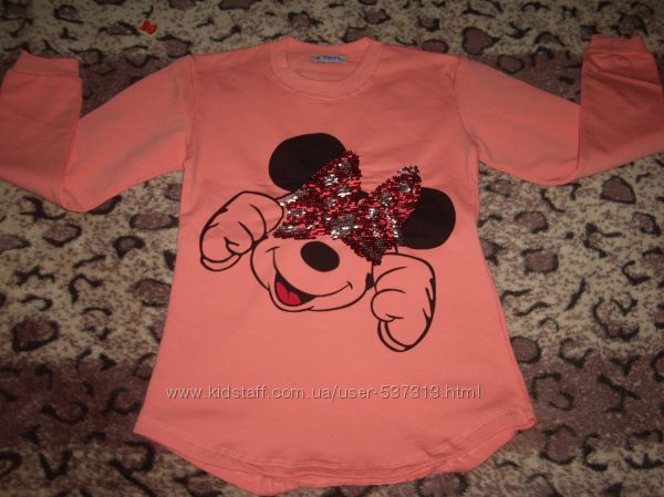 Оранжево-абрикосовая туничка с Микки. Указан возраст 10-11лет. ПОГ - 38см, рукав - 48/40см, длина - 58см. Цвет пайеток красный с серебром, меняет цвет, но местами,не целой картинкой, как другие.