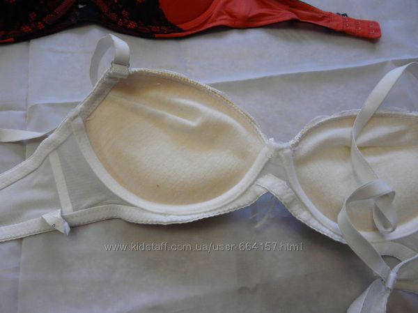 ФОТО 7-8 Бюстгальтер молочного, белого цвета, кружевная чашка. Фирма Lenka, чашка с плотным поролоном, пуш-ап, без косточек.Съемная бретелька 38/85. Подойдет на чашку В. Состояние хорошее. ФОТО 9-10 Бюстгальтер оранж с гипюрной вставкой Avant Premmiere.Материал похож на сатин, блестит. Чашка с плотным поролоном пуш-ап 70С, съемная бретелька, "родных бретелек нет. Состояние хорошее, нюанс .