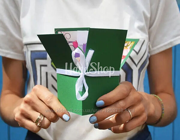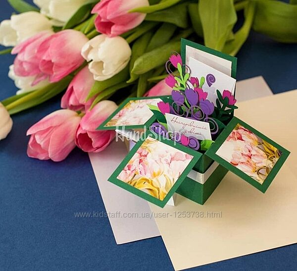 Особливості: листівка коробочки зі квітами – жіночі об’ємні листівки коробочки 12 x 12 см виготовлені з італійського дизайнерського картону. Усередині 3d святкової листівкикоробочки – 3D ілюстрація – тема жіноче свято – квіти тюльпани, завитки у