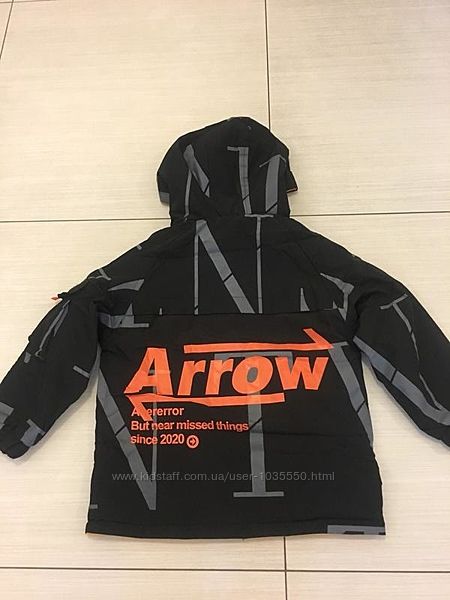 НОВИНКА ЭТОЙ ВЕСНЫ!!!Демисезонная двусторонняя куртка на мальчика от бренда Arrow.Цвет чёрный/красный,чёрный/желтый.Размеры 122-152р.Наполнитель холлофайбер.Капюшон не отстёгивается.Застежка под высокое горло.Модель прямого покроя,спереди два глубоких кармана.По всей куртке рисунок-надписи буквами.Сзади крупным планом написано название фирмы-производителя.Курточка двусторонняя,можно носить на две стороны.Внутри идёт или красный или желтый цвет.Рукава с отворотом для регулировки длины и трикотажными манжетами для тепла.
