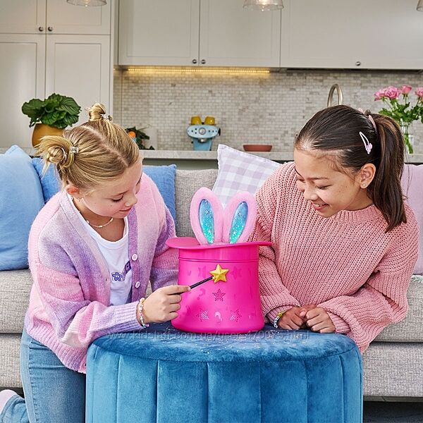 Приготуйтеся відкрити для себе понад 20 різноманітних чарівних функцій! Барвисте блимання вушок, захопливі фокуси, магічні фрази та казкові мелодії разом створюють неймовірну атмосферу магії, наповнену дивацтвами і приємними сюрпризами!Не засмучуйтесь, якщо з першого разу капелюх не відкрився. Про це чарівні вушка повідомлять червоним блиманням і відповідною мелодією, тому пробуйте знову і знову!Будьте напоготові, адже у будь-який момент вушка можуть засвітитися зеленим кольором і пролунає мила мелодія. Це означатиме, що магія спрацювала!Приготуйтеся, бо до появи загадкового кролика залишились лічені моменти! Його вушка замиготять веселковими переливами та пролунає барабанний дріб.Різко смикніть за м’які вушка, притримуючи капелюх, і вуаля! Під святковий феєрверк з конфетті та шквал оплесків кролик вже у ваших руках!Кожного разу, торкаючись його носика чарівною паличкою, лунатимуть три різні мелодії та магічні фрази, а вушка змінюватимуть колір дивовижним чином.Кролик-чарівник з м’яким хутром, блискучими великими очима, гарнесенькими маленькими лапками й пухнастим куцим хвостиком!Проте це ще не всі сюрпризи! Торкніться чарівною паличкою золотавої зірочки всередині капелюха, щоб відчинити потаємну кишеньку, де ви знайдете від 2-х до 4-х маленьких чарівних помічників — кроликів з чарівними властивостями сріблястого, блакитного чи рожевого кольорів.Кожен маленький помічник відповідного кольору має свої властивості: сріблястий може світитися у темряві, рожевий — змінювати забарвлення у холодній воді, а блакитний — змінювати колір під впливом сонячних променів. А також, усі маленькі помічники можуть перетворитися на топпер для олівця або до ручки.На дні капелюха є ще цікаві несподіванки! Це пухкеньке тісто для ліпки бузкового, блакитного або білого кольору й аркуш з наліпками. Усі аксесуари можуть світитися у темряві!В асортименті 2 кролики-чарівники: білий і рожевий! Зберіть їх усіх і обов’язково відмічайте їх у колекційному листі, який також є у наборі!Кожен з них має свою нашийну бірку, де можна записати ім’я і дату народження свого магічного улюбленця.Живлення: 3 батарейки типу ААА (входять у комплект)