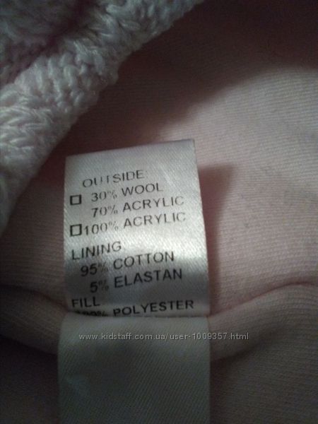 Состав: 30% шерсть, 70 % акрил, подкладка - 95 % хлопок, 5 % эластан. Помпон - натуральный мех.