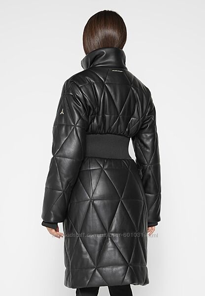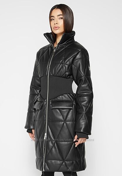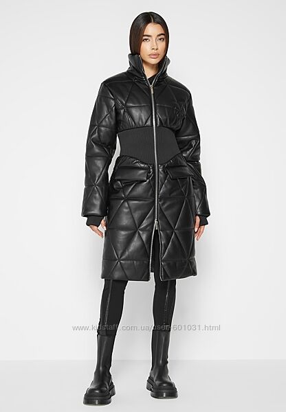 Черное длинное стеганое пальто из эко кожи с вязаной талией- формируют силуэт 😍
