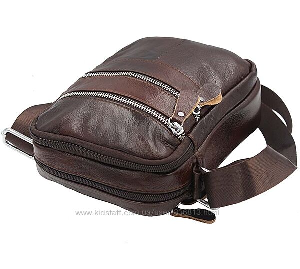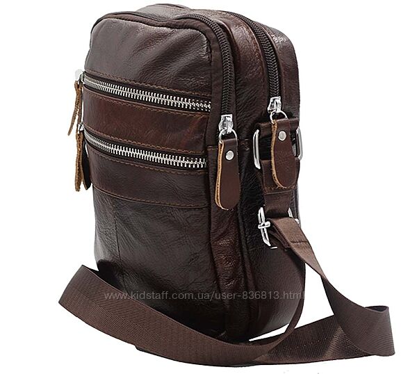 Сумка через плече чоловіча шкіряна коричнева, металеві молніїрозмір 22х16х8смДва основних відділення на блискавці. На фасаді відділення на змійці. На звороті відділення на молнії. Регульований ремінь на плече 64-135см.