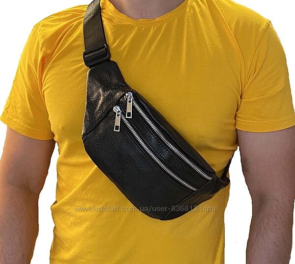 Сумка на пояс з натуральної шкірирозмір 35х14х6смДва відділення на мелалевый блискавці. Виглядає дуже стильно за рахунок якісної шкіри та металевих блискавок. Регульований ремінь на пояс. Максимальний обхват талії 170см, мінімальний 70см.