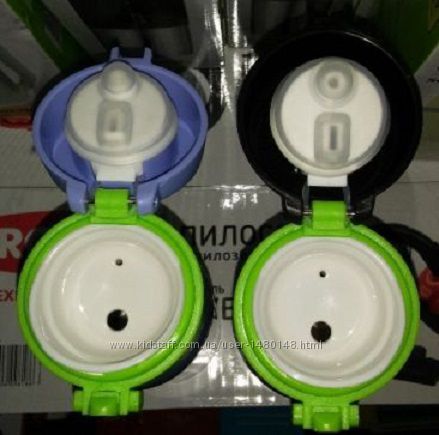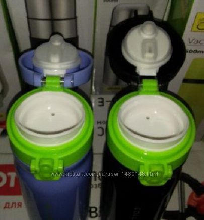 Пластиковая крышка-клапан открывается одним нажатием на кнопку для автоматического открытия, что позволяет разливать напиток и пользоваться для питья во время движения и снабжена специальным замком, что предотвращает случайное выливание содержимого.