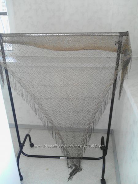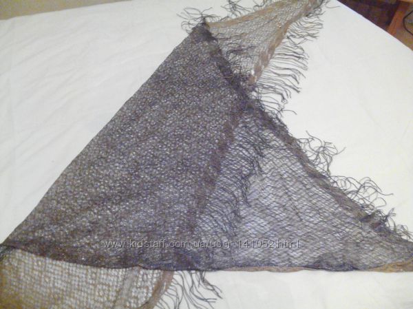 Тончайшая шаль с люрексом, с одной стороны золотого цвета, с другой - серебристого.Размер - ширина (вверху) - 153 см. Длина (сверху до узкого конца вниз ) - 125 см.