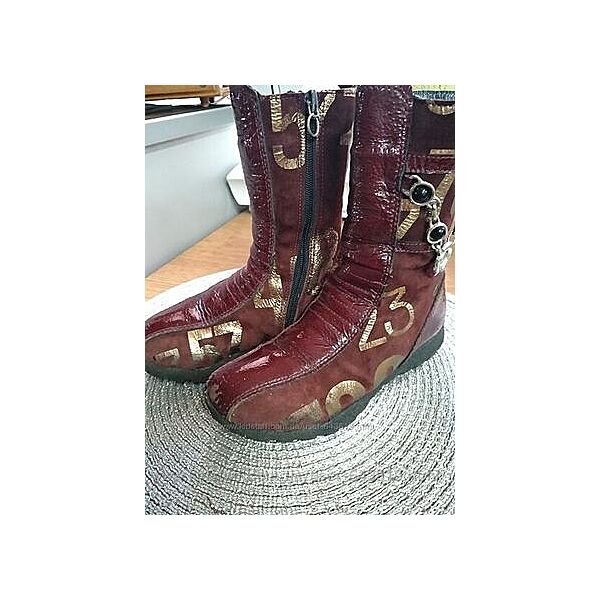Сапожки TSM на худенькую и узкую ножку. Кожа лаковая натур. + натур.замш. Внутри цигейка, по стельке тоже, очень теплые. Высота сапожка-20см. по стельке-18см. думаю пойдут на стопу 16,5-17см. т.к. узкие и внутри цигейка. Размер потерялся, стерся, был написан внутри на коже, на голенище. Носили немного. Состояние хорошее, не отклеено ничего, немного царапин.Перешлю любой почтой. Можно ОЛХ доставкой, дам ссылку.