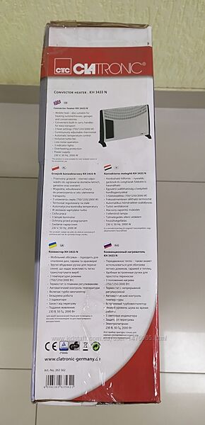 Привезенный из Германии новый конвекторный обогреватель Clatronic KH3433. Мощность потребления (макс.) - 2000 Вт, 3 положения мощности - 750, 1250, 2000 Вт, термостат с плавной регулировкой, функция тепловентилятора, раздувающего теплый воздух по комнате, защита от перегрева, с конвектром поставляется комплект для настенного крепежа и ножки для напольной установки. Отличное немецкое качество. Страна производства - Германия (КНР). Предоставляется настоящая документированная гарантия – 6 месяцев.Оплата - наложенный платеж либо предоплата на карту. Способы доставки: самовывоз, Новая Почта, Укрпочта, Деливери, Justin (отправка 2 раза в неделю). Возврат товара – в течении 14 дней при сохранении упаковки и отсутствии следов его использования.