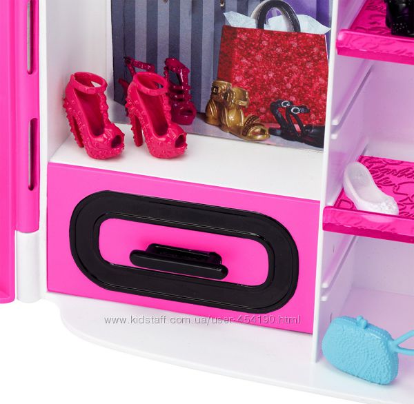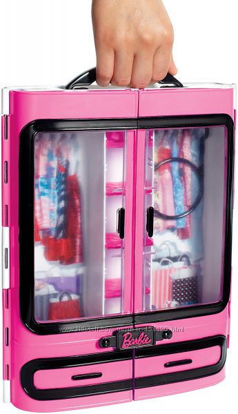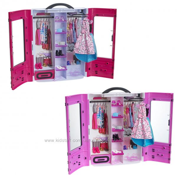 Шкаф-чемодан для одежды Барби Barbie Fashionistas ClosetВ комплекте 2 стильных платья, 3 пары элегантной обуви, 2 сумочки, 2 ожерелья и 6 вешалок для одежды.