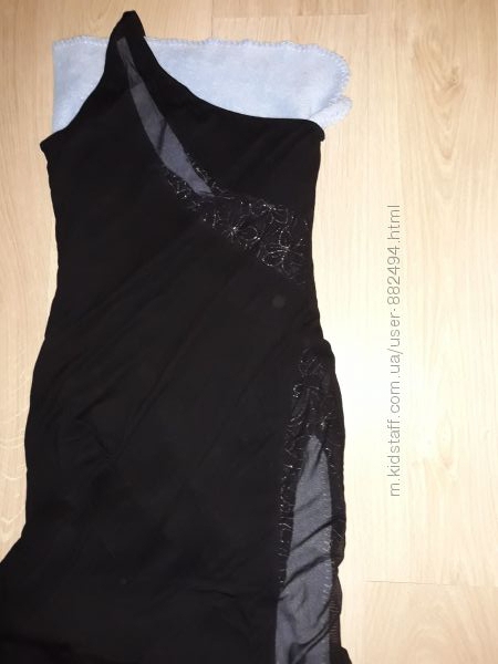 Красивое вечернее платье из плотного трикотажа. На одном плече бритель. От нее до правого бока талии идет сетчатая вставка декорированная темно синим кружевом с серебристыми цветами. Вдаль левой ноги такая же сетчатая вставка с кружевом. Платье очень женственное и элегантное.Размер 44-46. Цвет черный. Длинна до косточек при росте 172 см.