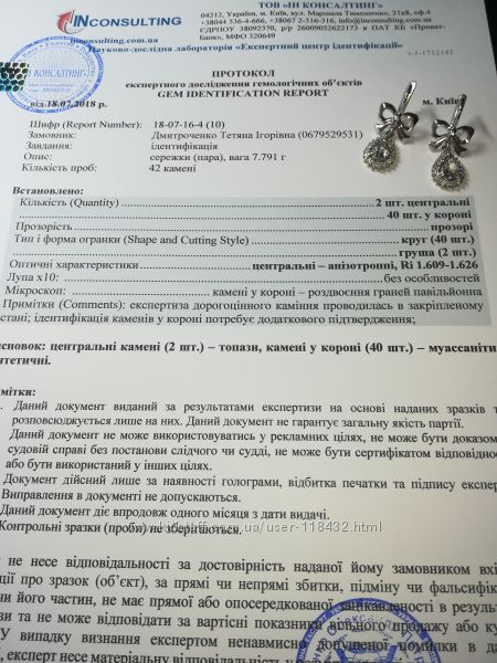 Вставка: 2 природных топаза весом по 2 карата каждый; 40 шт муассанитов по 1.5 каждый с характеристиками 2/2.