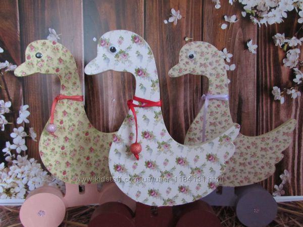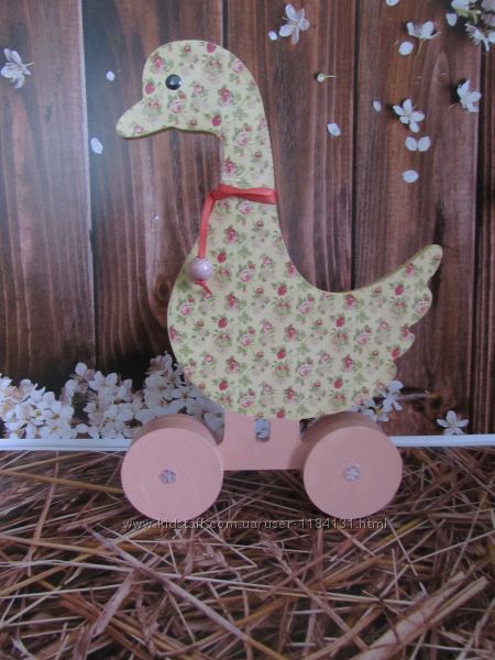 Гусик из влагостойкой фанеры 0,8 см,декорирован в технике декупаж. Колесики не крутятся. Гусик украшен шелковой ленточкой с бусинками. На колесиках полубусины в виде цветочка.Материалы использованные при декорировании на водной основе,не токсичны,не вредны для здоровья окружающих.