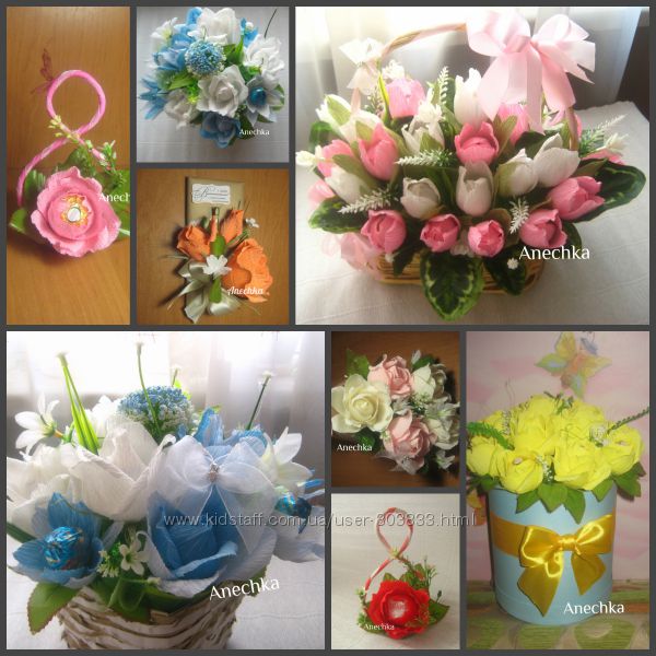 Хто не встиг придумати чи купити подарунок, є чудова ідея – солодкий букет із цукерок. Приймаю замовлення на виготовлення букетів із цукерок! Ціна на кожен букет розраховується індивідуально, залежно від кількості квітів у букеті, декору, оформлення та виду цукерок у квітах.Ще в мене ви можете придбати листівки, бантики для дівчаток, метелики-краватки для хлопчиків - все це ручної роботи.
