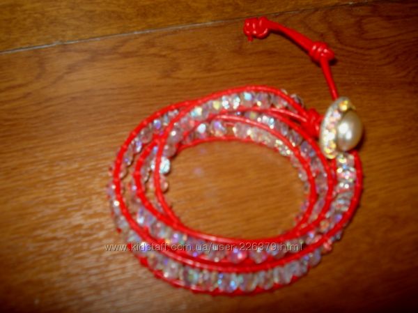 Фото №8 Браслет на красном кожаном шнуре,бусины чешские с галограммой.Очень красивая пуговица-застежка.Длина 63 см (две петельки для регулирования длины),на 3 оборота.Цена 400 гр.