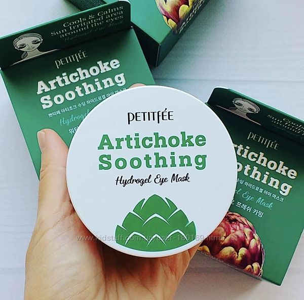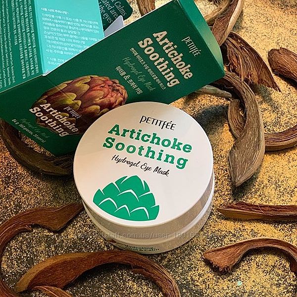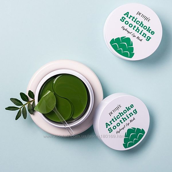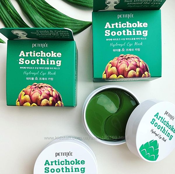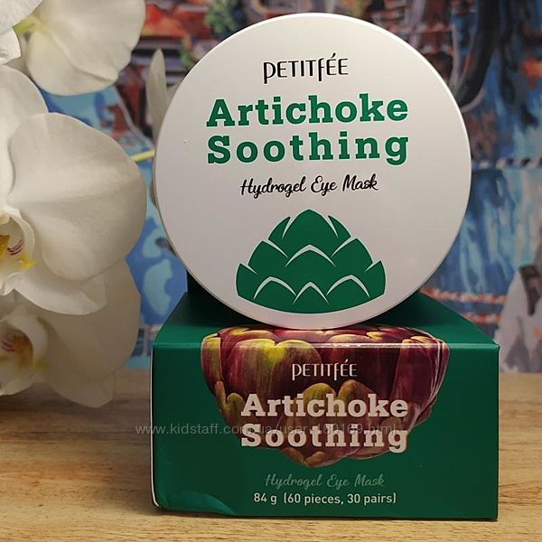 Petitfee&Koelf Artichoke Soothing Hydrogel Eye Patch – увлажняющие и успокаивающие патчи для век с экстрактом артишока. Они напитывают кожу влагой и разглаживают морщинки, осветляют «синяки» под глазами, снимают отёчность, подтягивают мешки, восстанавливают упругость и эластичность эпидермиса. Главный составляющий компонент - экстракт артишока, способствует выводу лишней жидкости из организма и устранению отеков тканей.