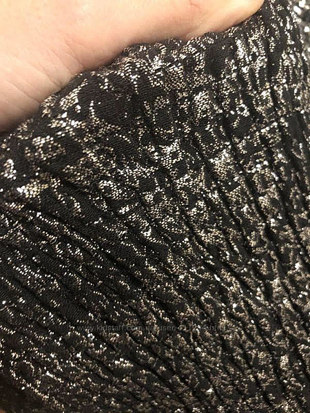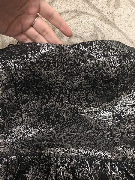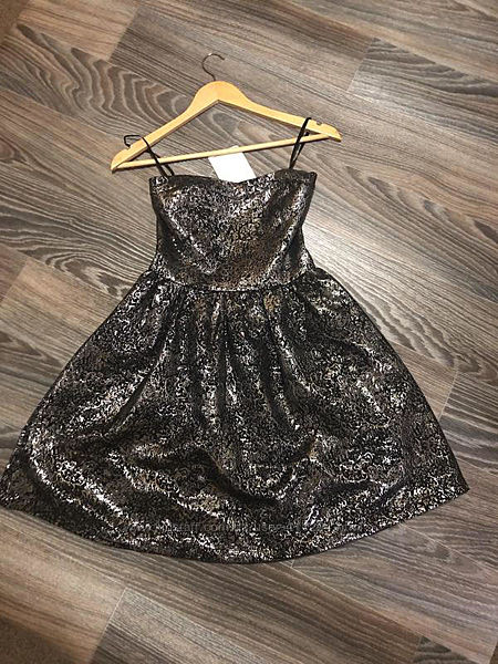 Нова сукня вечірня, святкова, фасон бандо, бюстье, без бретелей. Чорна зі сріблом. На спині резинка, ліф розтягується і добре тримається. Спідниця тримає форму.Заміри :