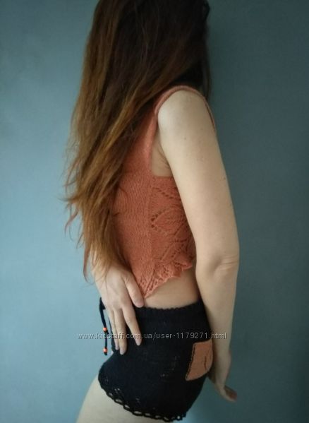 Комфортный и приятный к телу комплект для дома. В нем удобно заниматься домашними делами и отдыхать, и при этом хорошо выглядеть. Можно даже сбегать в магазин, если на улице лето.Комплект состоит из топа и шорт. Топ имеет ажурную спинку и гладкий перед. По низу топа и шорт - одинаковая ажурная кайма. В поясе шорт продернут шнурок с бусинами на концах, на попе карманы цвета топа.