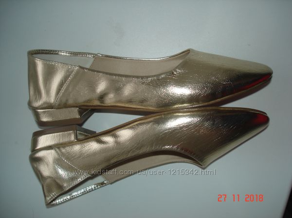 Эффектные, золотого цвета фирменные мюли, на комфортном каблучке 2 см.Сток. Указан размер 6. Кожзам, пятка-мягкий , туфельки-держат хорошо форму, но тоже, мягкие, комфортные.Полная длина стельки-25 см (если как туфельки), если как мюли -25,5 см.Другие объявления продавца