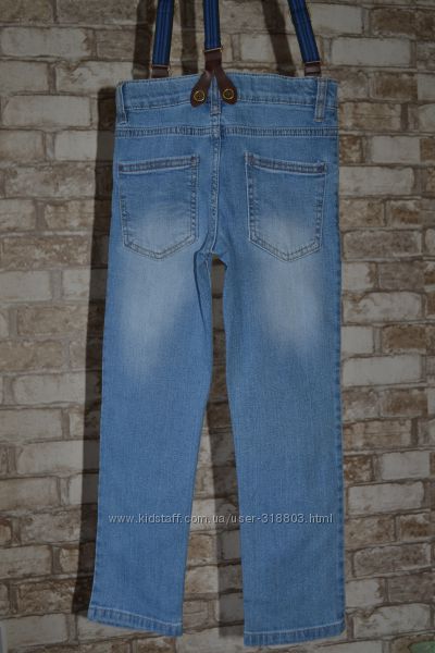 Джинсы Lupilu 5 - 6 лет, 110 - 116 см. Ткань 98% котон и 2% эластан, 3 кармашка впереди и 2 сзади, подтяжки снимаются и регулируются, пояс стягивается, дефектов нет, ид. сост.Замеры: пояс - 28 см. тянется,