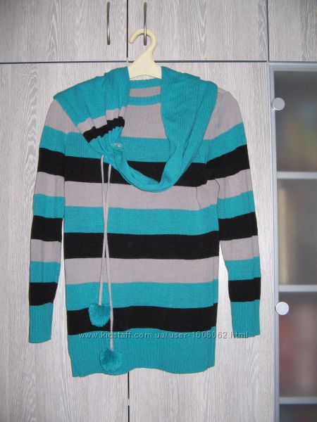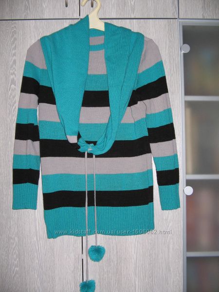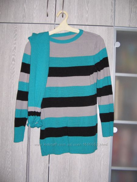 Свитерок в зеленую полоску с шарфом.Ширина по груди 48 см,длина 67 см,рукав 56 см .тянется хорошо цена 80 грнДругие объявления продавца