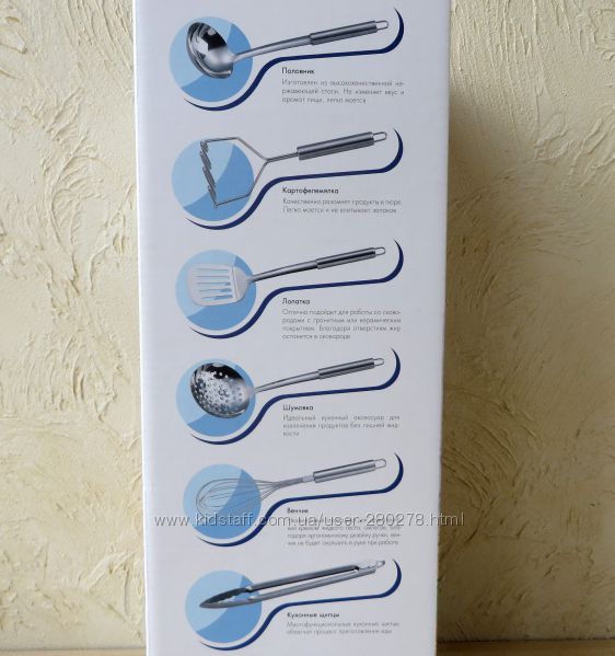 В набор входит: половник, картофеле-мялка, шумовка, кулинарные щипцы, венчик, лопатка, подставку.