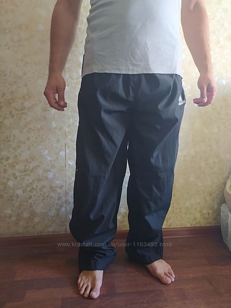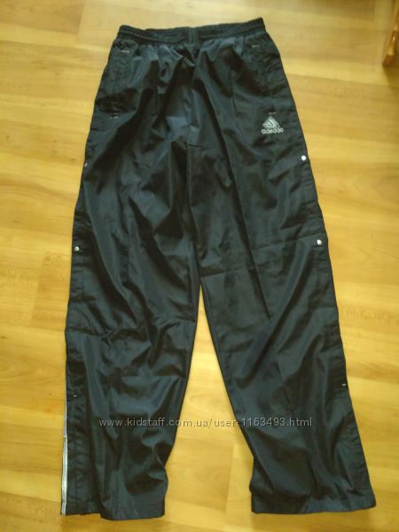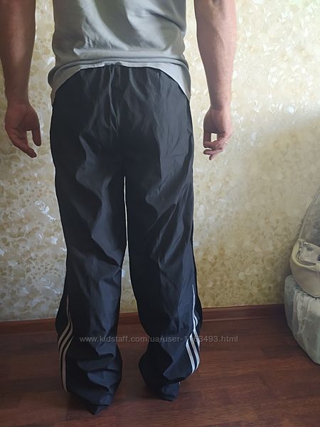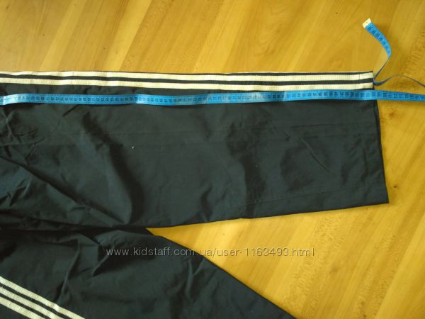 Вторые штаны фирмы адидас темно- синего цвета с тремя белыми полосками по бокам.Размер 32-34 либо 32-32,Размеры указаны на фото.(Длина штанов 107 см)