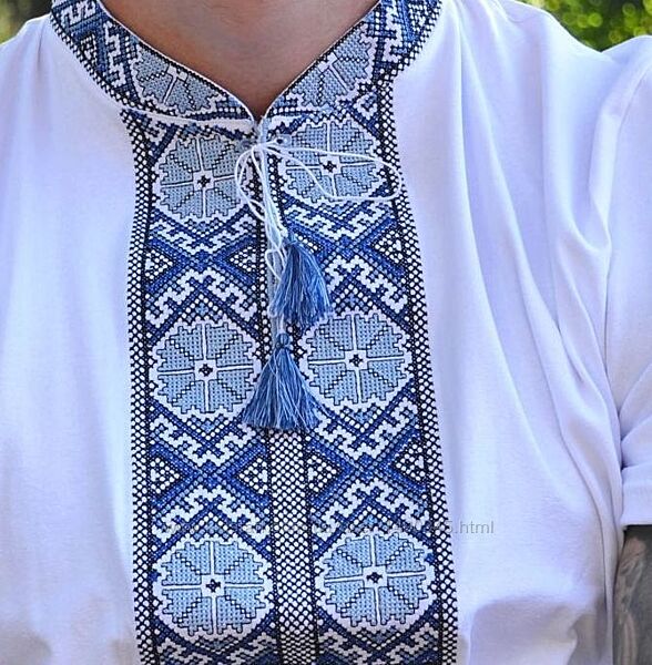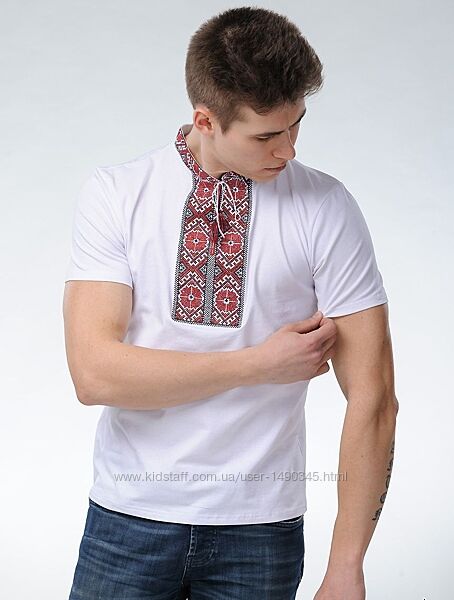 Вишита футболка для чоловіків в якій поєднано зручність крою та насиченість барв орнаменту. М’який трикотаж приємно прилягає до тіла, а виріз горловини регулюється китицями. Вишиванка оздоблена українським орнаментом синього, оливкового, червоного на білому тлі. Вишивку нанесено на грудях та на комірці-стійці.Склад тканини: трикотаж (95% бавовна+5% еластан) , матеріал дуже приємний до тіла, дозволяє шкірі дихати та не парить.