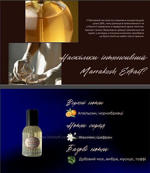Marrakesh Extrait de Parfum28% концентрації. Максимум стійкості. Марракеш = місто, що втягує своїм незабутнім ароматом. Відкриваючи очі на світанку, зустрічати спів муедзіна, що закликає на молитву. Аромати Марракеша наповнюють кімнату – пряний шафран, апельсин та бархатці, що доносяться з головного ринку.