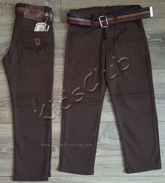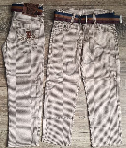 Цветные штаны на мальчика в мелкий ромбик. Приблизительно на рост от 98 до 158. Ткань стрейчевая, в комплекте есть пояс. Покрой прямой. Утяжка есть во всех размерах. Производитель Турция.Рисунок ткани видно на последнем фото.