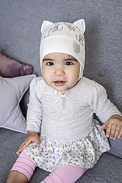 Шапка трикотажная двойная для девочки фабрики Девид Стар, Украина. Состав: верх 95% хлопок, 5% эластан, подклад 95% хлопок, 5% эластан.Размеры 42,44,46 см на возраст от 3 месяцев до 1 года.