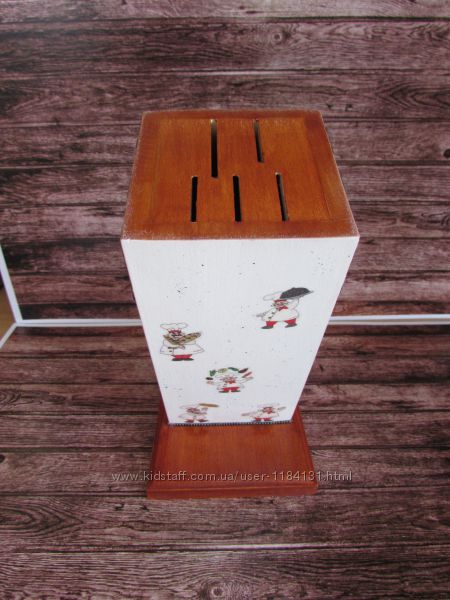 Размеры:для соли-11х20х12,5см,для дивайсов-диаметр-8 см,высота – 21,5 см,для ножей-14,5х10,5см,рабочая-8х8,5,салфетница-16х5х7,5см