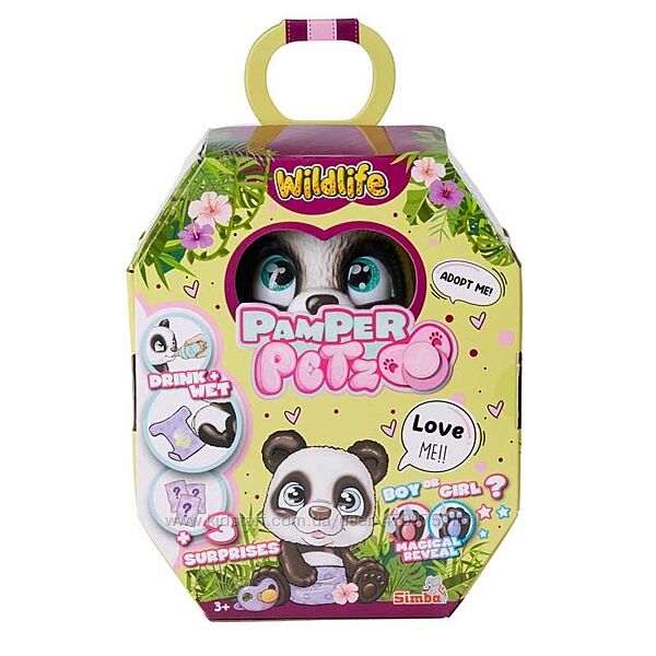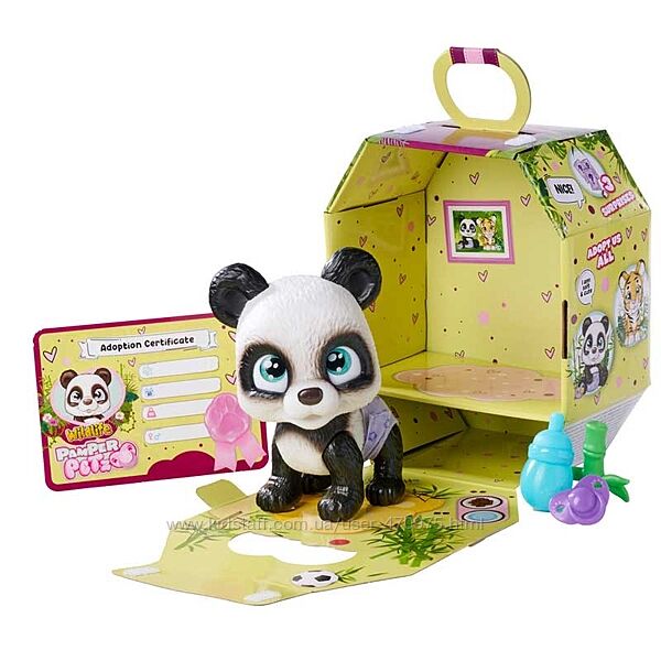 лапки та голова пандочки рухаються, а до ротика можна вставляти аксесуари: пляшечку, пустушку або смаколик;іграшка вміє пити воду з пляшечки та ходити в туалет у памперс (при потраплянні води він жовтіє);малюк визначить стать свого улюбленця завдяки чарівній лапці, що при намоканні змінює колір;які саме аксесуари будуть в наборі дитина взнає після розпакування 3-х пакетиків-сюрпризів;набір виготовлений з високоякісних, безпечних для здоров´я дитини матеріалів.В комплекті:
